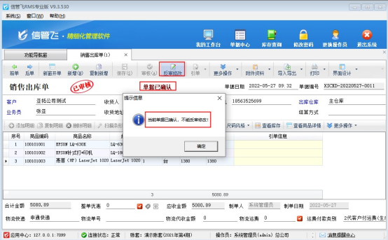 信管飛RMS軟件支持設(shè)置操作員設(shè)置反審修改權(quán)限,操作員有反審修改權(quán)限就可以對(duì)已審核單據(jù)進(jìn)行反審操作,有客戶需要已審核的單據(jù)不能再進(jìn)行修改,針對(duì)這一情況,最新版本添加了單據(jù)確認(rèn)功能,本文示范下單據(jù)確認(rèn)功能如果使用?