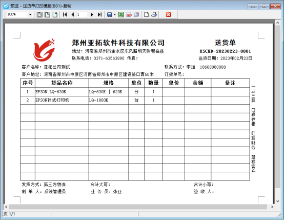 新開一個銷售出庫單,打印下點擊打印預覽,默認模板“送貨單打印模版(B01)”預覽界面如下所示,含單價和金額。