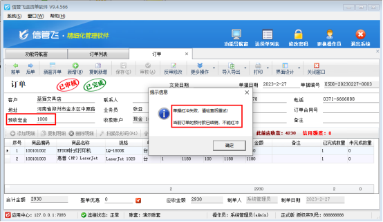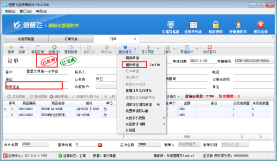 無定金的訂單,已審核已完成狀態(tài)的訂單可直接打開,在更多操作下點擊“紅沖單據(jù)”,先紅沖作廢,然后再點擊“刪除單據(jù)”可以直接刪除成功,如下圖所示: