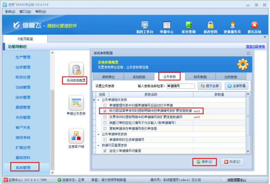 首先需要先啟用參數(shù),在功能導(dǎo)航窗點(diǎn)擊“系統(tǒng)管理”—“系統(tǒng)參數(shù)配置”,選擇業(yè)務(wù)參數(shù),找到參數(shù)“收付款結(jié)算單保存時(shí)提取明細(xì)中的單據(jù)編號(hào)到擴(kuò)展信息數(shù)據(jù)項(xiàng)”勾選并保存參數(shù)配置,參數(shù)值默認(rèn)是擴(kuò)展信息1,可修改。如下圖所示: