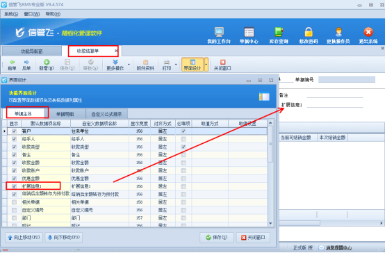 參數(shù)設(shè)置完成后,功能導(dǎo)航窗點(diǎn)擊“往來(lái)管理”—“應(yīng)收款管理”,選擇未結(jié)銷的應(yīng)收款記錄,點(diǎn)擊“收款結(jié)算”進(jìn)入收款結(jié)算單界面。收款結(jié)算單打開(kāi)“界面設(shè)計(jì)”,單據(jù)主體中勾選顯示擴(kuò)展信息1,移動(dòng)到合適位置后保存界面設(shè)計(jì),然后正常結(jié)算,結(jié)算單保存后對(duì)應(yīng)的應(yīng)收款的記錄的銷售單單據(jù)編號(hào)會(huì)自動(dòng)提取到擴(kuò)展信息1中,如下圖所示: