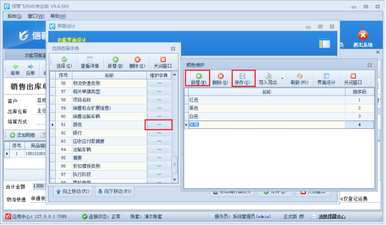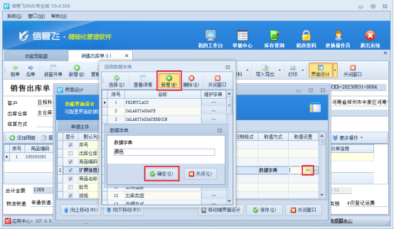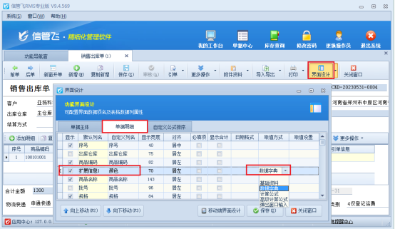 在功能導(dǎo)航欄點(diǎn)擊銷(xiāo)售管理---打開(kāi)銷(xiāo)售出庫(kù)單,在開(kāi)單界面點(diǎn)擊界面設(shè)計(jì),勾選擴(kuò)展信息并自定義列名為“顏色”,取值方式選擇“數(shù)據(jù)字典”,如圖所示: