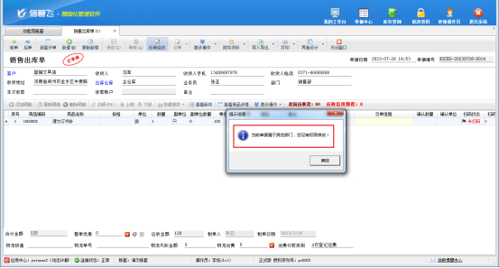 點(diǎn)擊“銷售管理”-》“銷售出庫(kù)單”,打開(kāi)一個(gè)已開(kāi)銷售單,反審修改單據(jù),出現(xiàn)以下提示: