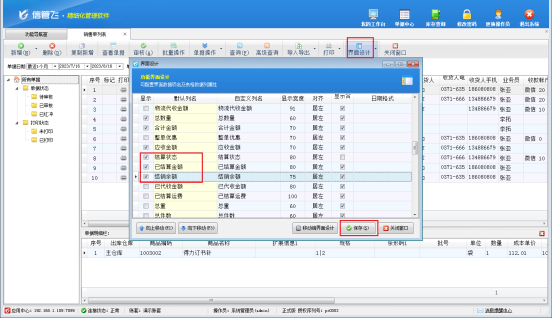 參數(shù)配置完成后,打開(kāi)“銷售管理”—》“銷售單列表”界面,界面設(shè)計(jì)中把數(shù)據(jù)項(xiàng)“已結(jié)算金額、結(jié)算余額、結(jié)算狀態(tài)”勾選顯示,保存界面設(shè)計(jì),如下圖所示: