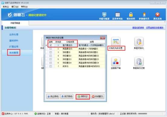 在功能導(dǎo)航窗點(diǎn)擊“系統(tǒng)管理”—“價(jià)格優(yōu)先級(jí)設(shè)置”,在價(jià)格優(yōu)先級(jí)設(shè)置中勾選啟用“客戶最近價(jià)”并向上移動(dòng)到第一位,然后保存商品價(jià)格優(yōu)先級(jí)設(shè)置。如下圖所示: