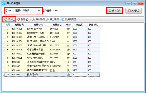 功能導(dǎo)航窗點(diǎn)擊“基礎(chǔ)資料”,打開“客戶價(jià)格信息”界面,點(diǎn)擊“新增”按鈕下的“按客戶添加價(jià)格信息”,彈出的客戶價(jià)格信息界面,先選擇客戶,然后點(diǎn)擊“添加明細(xì)”添加商品信息,輸入銷售價(jià)(支持導(dǎo)入操作),輸入完成點(diǎn)擊保存按鈕。如下圖所示: