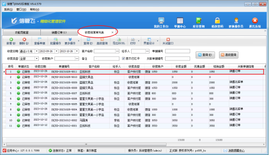 在功能導航窗打開“往來管理”—》“收款結算單”,在收款結算單列表界面找到客戶銷售訂單的預付款單據,雙擊打開進入收款結算單界面。