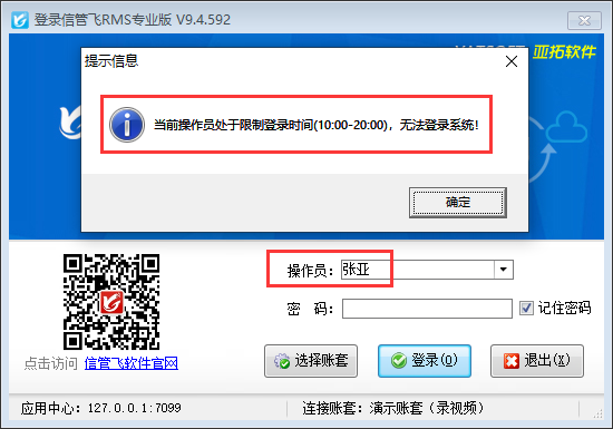 信管飛系列軟件支持自定義設(shè)置操作員登錄軟件的時(shí)間,設(shè)置后,操作員在受限制時(shí)間內(nèi)則無法登錄軟件。出現(xiàn)以上問題的原因是,操作員在受限時(shí)間內(nèi)登錄的軟件。