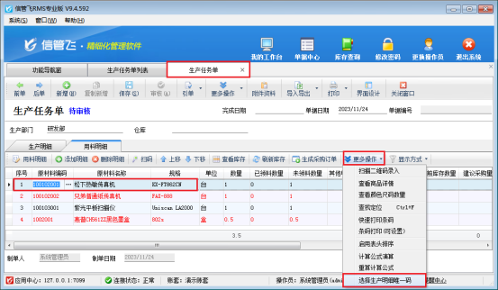 在功能導(dǎo)航欄點(diǎn)擊生產(chǎn)管理--生產(chǎn)任務(wù)單,在生產(chǎn)任務(wù)單界面選擇用料明細(xì),點(diǎn)擊更多操作下-----選擇生產(chǎn)明細(xì)唯一碼,每一條用料明細(xì)都需要對(duì)應(yīng)生產(chǎn)明細(xì)唯一碼,然后保存任務(wù)單,如圖所示: