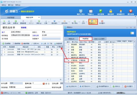 在銷售出庫單開單界面,在工具欄打開界面設(shè)計,選擇單據(jù)明細,勾選顯示出“擴展數(shù)值1”,開單界面中顯示此項并輸入擴展數(shù)值1內(nèi)容,如下圖所示: