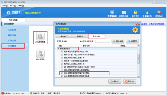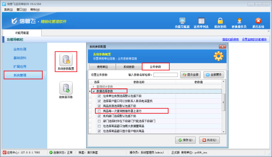 在功能導(dǎo)航窗點(diǎn)擊“系統(tǒng)管理”—》“系統(tǒng)參數(shù)配置”—》“業(yè)務(wù)參數(shù)”,即可進(jìn)入到“業(yè)務(wù)參數(shù)”配置界面,在數(shù)據(jù)選擇參數(shù)內(nèi)取消勾選“商品每一次查詢到服務(wù)器上進(jìn)行”參數(shù),然后點(diǎn)擊“保存”按鈕保存設(shè)置,如下圖2所示: