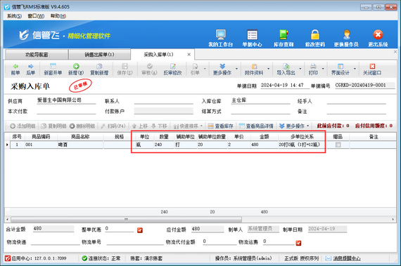 提高操作效率:在采購進貨、銷售出庫以及庫存管理等環(huán)節(jié),我們經常需要用到不同的計量單位。有了輔助單位功能,我們無需手動進行單位換算,軟件會自動完成,大大提高了我們的操作效率。如下圖所示,啤酒采購入庫240瓶(輔助單位數量:20打)。