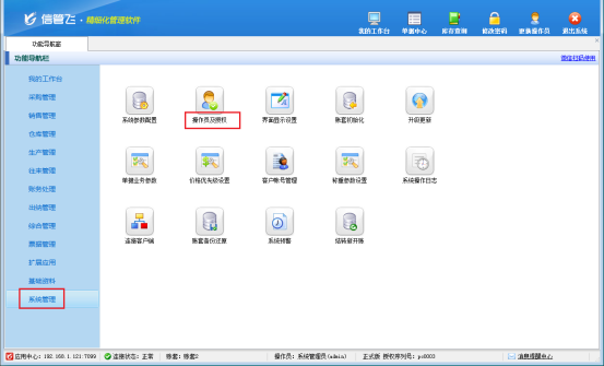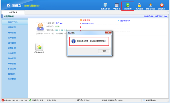 信管飛軟件支持設(shè)置多個(gè)操作員賬號(hào)并對(duì)操作員賬號(hào)設(shè)置權(quán)限,有用戶操作員賬號(hào)登錄時(shí),查詢庫(kù)存可能會(huì)出現(xiàn)“您沒(méi)有操作權(quán)限,請(qǐng)與系統(tǒng)管理員聯(lián)系!”的提示,導(dǎo)致無(wú)法進(jìn)行庫(kù)存查詢,這是由于操作員沒(méi)有權(quán)限造成的,本篇文章以“信管飛RMS專業(yè)版”為例介紹下如何解決?