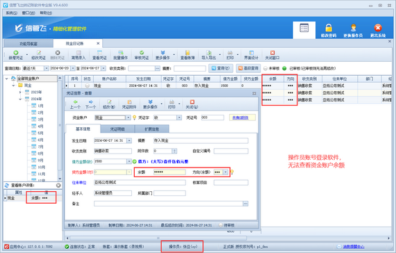 在資金賬戶余額管理方面,信管飛出納記賬軟件提供了嚴格的權(quán)限控制。企業(yè)可以設定特定操作員無法查看資金賬戶余額,從而有效防止敏感信息的泄露。這樣的設計不僅保護了企業(yè)的財務隱私,也增強了企業(yè)內(nèi)部的信任與協(xié)作。