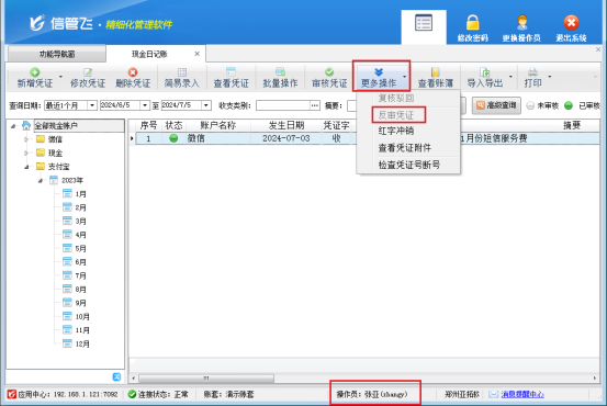 信管飛出納記賬軟件中支持反審憑證,憑證已審核后如發(fā)現(xiàn)填寫錯(cuò)誤,可以反審憑證,反審后,憑證狀態(tài)恢復(fù)為未審核狀態(tài),可以繼續(xù)對(duì)這個(gè)憑證進(jìn)行修改操作,然而,部分用戶反饋,在使用操作員賬號(hào)登錄時(shí),可能會(huì)遇到無(wú)法對(duì)已審核憑證執(zhí)行反審并修改的問(wèn)題。切換系統(tǒng)管理員登錄,可以正常對(duì)憑證進(jìn)行修改,這是由于操作員沒(méi)有反審日記賬憑證導(dǎo)致的,本文以“信管飛出納記賬軟件”為例進(jìn)行示范。