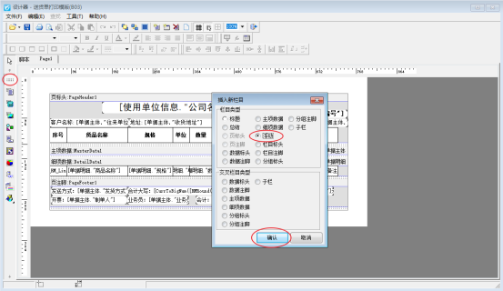 首先進(jìn)入模板設(shè)計器界面(開單界面打印按鈕下點擊打印格式設(shè)計,在打印格式設(shè)計界面選擇模板點擊設(shè)計格式進(jìn)入設(shè)計器界面),點擊左側(cè)工具欄的“插入邊條”,選擇“浮動”位置放到多聯(lián)備注處,包圍備注內(nèi)容,如下圖所示: