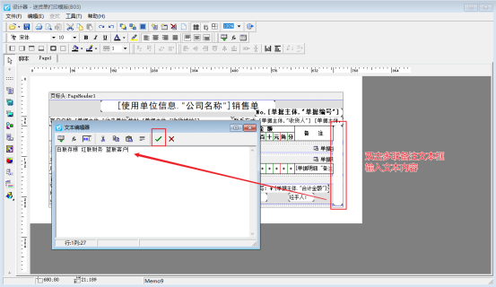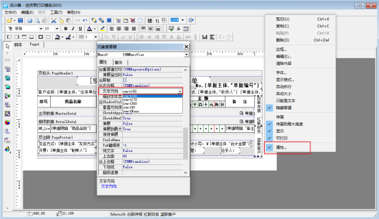 雙擊右側(cè)多聯(lián)備注文本框,輸入多聯(lián)備注內(nèi)容,選中多聯(lián)備注文本框,右鍵選擇屬性,修改文本框的“文字方向”屬性為“rmrt180”,如圖所示: