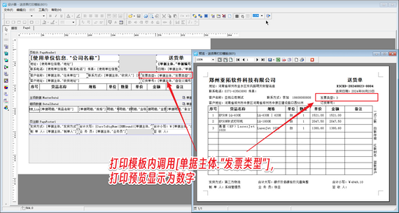 打印送貨單時同樣需要打印“發票類型”,但是在設計模板時直接調用[單據主體."發票類型"]數據項,打印預覽送貨單時,發票類型會顯示為數字,而不是文字內容,如下圖所示。