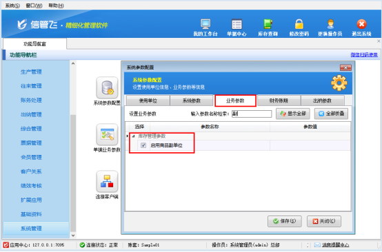 在功能導(dǎo)航窗中點(diǎn)擊“系統(tǒng)管理”—“系統(tǒng)參數(shù)配置”,進(jìn)入“系統(tǒng)參數(shù)配置”界面。然后,點(diǎn)擊“業(yè)務(wù)參數(shù)”,在庫存管理參數(shù)內(nèi)找到“啟用商品副單位”參數(shù),并勾選此參數(shù)保存。啟用后,在商品信息中可以維護(hù)副單位信息。