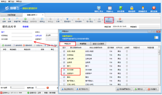 在功能導(dǎo)航窗點擊“銷售管理”,打開銷售出庫單界面,單據(jù)主體可輸入本次收款金額和收款賬戶,如果單據(jù)主體沒有這兩項,可在工具欄點擊“界面設(shè)計”勾選顯示出這兩項,如下圖所示: