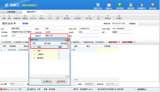 選擇客戶和商品開單,直接收款可直接輸入到本次收款中,收款賬戶默認(rèn)取資金賬戶的默認(rèn)賬戶。如有多個收款賬戶時,把應(yīng)收金額輸入到收款賬戶中,本次收款金額會自動顯示,如下圖所示: