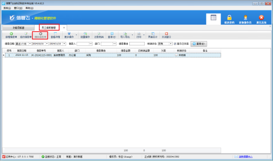 操作員權(quán)限設(shè)置完成后,切換操作員“張亞”登錄軟件,在功能導(dǎo)航窗點擊“綜合管理”—》“員工借款管理”打開員工借款管理界面,此時可以看到操作員賬號已無法刪除借款單了,如下圖所示。
