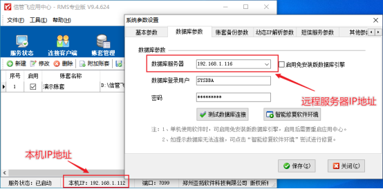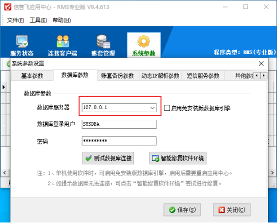 打開(kāi)應(yīng)用中心界面---系統(tǒng)參數(shù)---數(shù)據(jù)庫(kù)參數(shù)界面,數(shù)據(jù)庫(kù)服務(wù)器修改為主機(jī)本機(jī)IP地址才可以附加賬套,數(shù)據(jù)庫(kù)服務(wù)器可輸入:127.0.0.1
