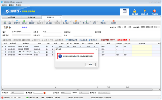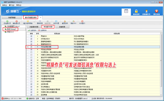 出現(xiàn)以上問題的原因是:當前登錄的操作員賬號沒有可發(fā)送微信消息的權限。