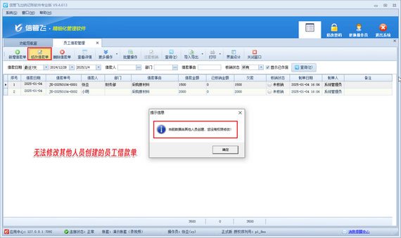 有用戶(hù)操作員賬號(hào)登錄軟件修改員工借款單時(shí),提示“當(dāng)前數(shù)據(jù)由其他人員創(chuàng)建,您沒(méi)有權(quán)限修改!”,如下圖所示。
