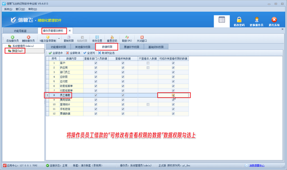 解決方法如下:使用系統(tǒng)管理員賬號(hào)登錄軟件,在功能導(dǎo)航窗點(diǎn)擊“系統(tǒng)管理”—》“操作員及授權(quán)”打開(kāi)操作員管理及授權(quán)界面,選擇操作員賬號(hào),在“數(shù)據(jù)權(quán)限”界面將員工借款“可修改有查看權(quán)限的數(shù)據(jù)”的權(quán)限勾選上,然后保存權(quán)限設(shè)置,如下圖所示。