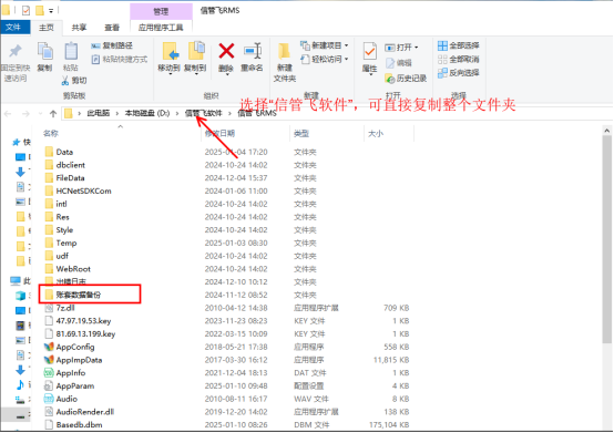 選擇桌面圖標,點擊鼠標右鍵選擇“打開文本位置”,可打開文件保存位置,選擇“信管飛軟件”文件夾,復制整個文件夾到新電腦上,如果文件過大,可把“賬套備份文件”中的之前日期數(shù)據刪除。如下圖所示: