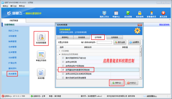 設(shè)置過程簡單明了:在系統(tǒng)管理模塊中,找到系統(tǒng)參數(shù)配置,并啟用基礎(chǔ)資料數(shù)據(jù)項權(quán)限控制功能。保存配置后,使用系統(tǒng)管理員賬號登錄軟件,進(jìn)入操作員管理及授權(quán)界面,即可為不同操作員分配具體的權(quán)限。
