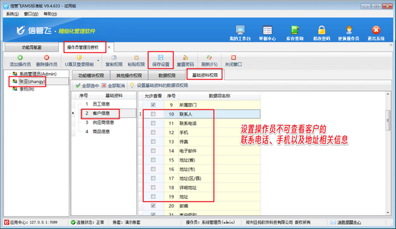 以信管飛RMS標(biāo)準(zhǔn)版為例,這款軟件提供了強(qiáng)大的權(quán)限管理功能,讓企業(yè)管理者能夠輕松設(shè)置操作員對不同數(shù)據(jù)的訪問權(quán)限。比如,你希望某些操作員無法查看客戶的聯(lián)系電話和地址信息,以確?蛻綦[私不被泄露。