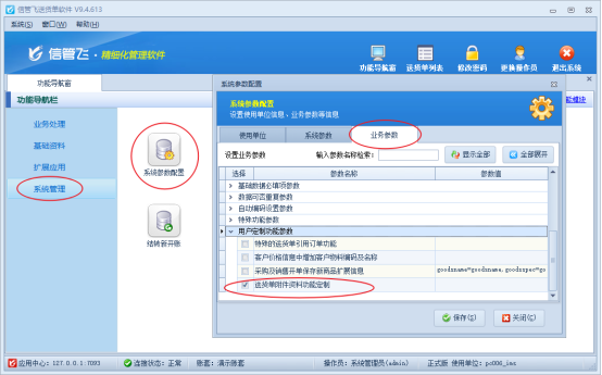 在功能導航窗點擊“系統管理”—》“系統參數配置”—》“業務參數”,打勾“送貨單支持打印附件資料中的圖片”,保存設置,如下圖所示: