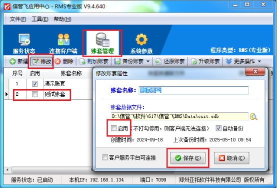 假設當前賬套列表中有多個賬套處于啟用狀態,現在我們需要停用一個賬套。操作過程十分簡單,只需選中該賬套,點擊“修改”按鈕,系統便會彈出修改帳套屬性窗口。在這個窗口中,我們只需取消“啟用”前面的打勾,然后點擊“保存”按鈕,即可完成賬套停用設置。