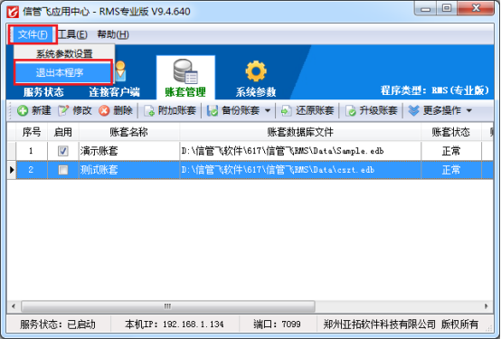 保存修改后,再次查看賬套列表,會發現該帳套的啟用對勾已經取消,這表明該賬套已成功停用。為了確保設置生效,可以點擊“文件”—》“退出本程序”,先退出應用中心,然后再重新運行紅色應用中心。