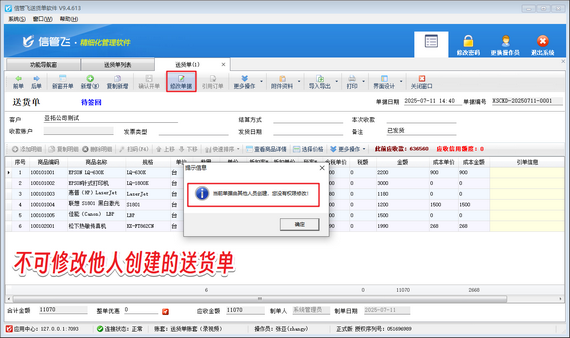 有用戶操作員賬號登錄軟件在修改送貨單時,無法修改送貨單,提示:“當(dāng)前單據(jù)由其他人員創(chuàng)建,您沒有權(quán)限修改!”如下圖所示。
