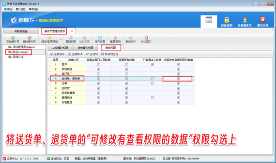 解決方法如下:使用系統(tǒng)管理員賬號登錄軟件,在功能導(dǎo)航窗點擊“系統(tǒng)管理”—》“操作員及授權(quán)”打開操作員管理及授權(quán)界面,選擇操作員賬號,在“數(shù)據(jù)權(quán)限”界面將送貨單、退貨單的“可修改有查看權(quán)限的數(shù)據(jù)”的權(quán)限勾選上,然后保存權(quán)限設(shè)置,如下圖所示。