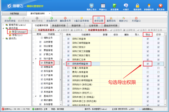 首先使用系統(tǒng)管理員賬號登錄軟件,在功能導航窗中,點擊“系統(tǒng)管理”—》“操作員及授權(quán)”,進入“操作員管理及授權(quán)”界面,在操作員列表中,選擇需要設置權(quán)限的操作員,例如“張亞”,在其右側(cè)的功能模塊權(quán)限內(nèi),找到“采購查詢”模塊,將采購單明細查詢的“導出”權(quán)限勾選,然后點擊保存按鈕保存。