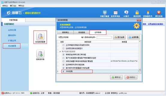 進入「系統管理」→「系統參數配置」→「業務參數」,在“用戶定制功能參數”中勾選“XHGB定制”,保存即可。