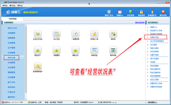 有信管飛RMS專業(yè)版用戶升級新版本后,在財(cái)務(wù)處理模塊無法查看經(jīng)營狀況表,如下圖所示。 演示視頻觀看鏈接:信管飛RMS專業(yè)版如何設(shè)置顯示經(jīng)營狀況表演示視頻 出現(xiàn)以上問題的原因是:新版本默認(rèn)經(jīng)營狀況表隱藏顯示。 解決方法如下:使用系統(tǒng)管理員賬號登錄軟件,在功