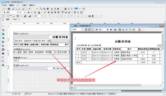 單據審核狀態是指在業務流程中,單據處于審核流程的不同階段所呈現的狀態,它反映了單據處理進展與結果,信管飛RMS開單審核后查詢界面顯示審核狀態,在對賬統計打印時,支持打印單據的審核狀態。     打印對賬單時同樣需要打印“審核狀態”,但是在設計模板時直接調用[統計信息.審核]數據項,打印預覽對賬單時,審核狀態會