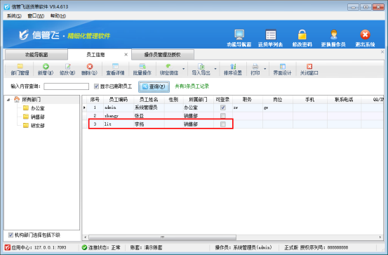 信管飛軟件支持設置多個可登錄操作員,可不同人員登錄軟件進行操作開單。在員工信息界面,可登錄員工對應的可登錄狀態顯示勾選,如下圖所示:     如何設置員工“李拓”可登錄狀態取消勾選?在功能導航窗點擊“系統管理”—》“操作員及授權”界面。選擇操作員“李拓”,點擊工具欄“刪除操作員”,刪除成功后員工不能再登錄軟件,如下圖所示: