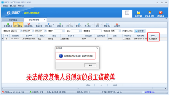 在財務管理的日常工作中,員工借款單的權(quán)限管控是確保數(shù)據(jù)安全與責任明確的關(guān)鍵環(huán)節(jié)。信管飛出納記賬軟件通過靈活的權(quán)限配置功能,可實現(xiàn)操作員僅能編輯本人創(chuàng)建的借款單,而無法修改他人單據(jù)。本文將詳細介紹如何通過軟件設置,實現(xiàn)操作員無法修改他人創(chuàng)建的員工借款單,保障財務數(shù)據(jù)的完整性與合規(guī)性。 演示視頻觀看鏈接:出納記賬軟件如何設置操作
