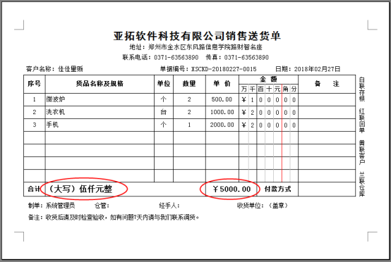 亞拓管理軟件、信管飛送貨單軟件、信管飛倉(cāng)庫(kù)管理軟件等支持打印單據(jù)內(nèi)容,支持自定義設(shè)計(jì)打印模板,有時(shí)候模板字體需要加粗加大顯示,可以設(shè)置打印模板中的字體格式。我們以送貨單軟件為例,介紹下如何設(shè)置打印模板中字體加粗加大顯示。 先新增一個(gè)送貨單,正常開(kāi)單后確認(rèn)開(kāi)單,預(yù)覽之前的模板,合計(jì)金額的字體是未加粗樣式,如下圖1所示:&nbs