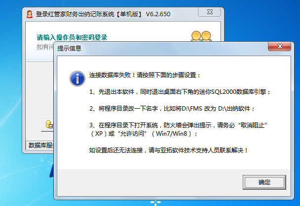 近期接到不少客戶反饋,以前使用的是Windows XP操作系統,由于微軟停止XP技術支持更新,機器安裝成Windows7或Windows 8操作系統后,登錄紅管家財務出納記賬軟件的時候提示無法連接數據庫的錯誤提示,如下圖所示: 出現這種問題的原因是:Windows 7/Windows 8操作系統的默認賬戶雖然是管理員賬戶,但在很大程度上對于一部分系